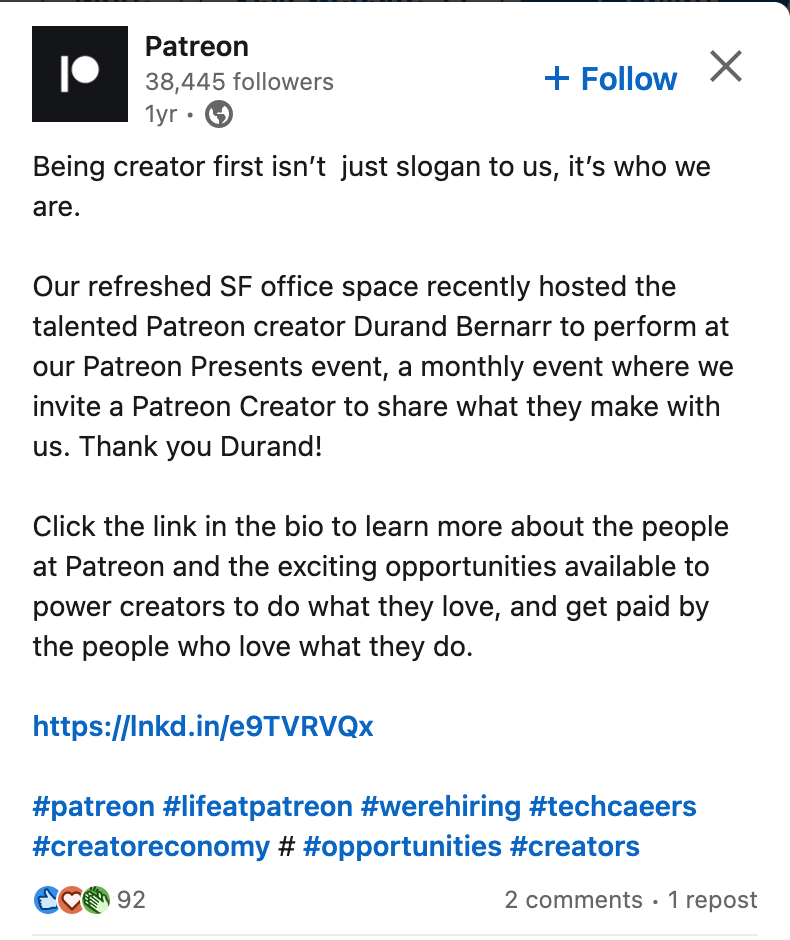 I managed the posting, analytics, content & design for the 'Life At Patreon Instagram account. I also made sure our employees had assets they could use and share to garner support and reach for all the top talent in the market. Our team along with a consulting agency published sponsored and non-sponsored ads on social media to leverage that reach.